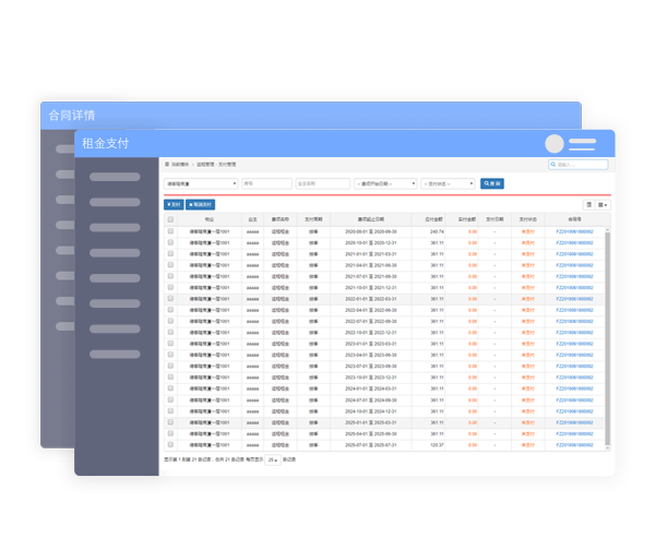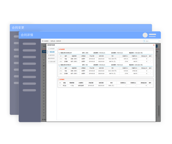 合同管理与维护,打印租赁合同;合同签订添加各种费项,系统自动生成付款账单,并可提交工作流程会签审批;合同到期提前预警,控制资产风险。