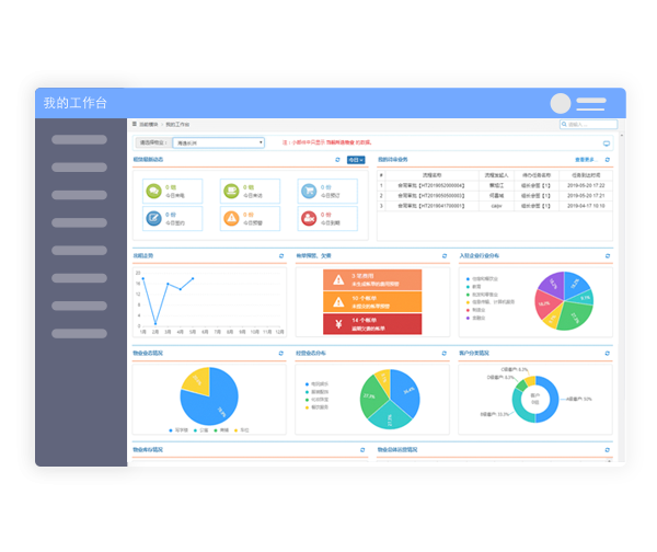 显示主要的业务数据信息,可以对相关业务直接进行办理。是常用业务功能的集合,可以根据不同业务权限,配置不同的工作台显示内容。