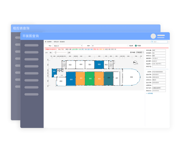 平面图方式实时展示物业单元的业务状态,如:待租、预订、签约、预警、到期等;点击待租单元,可以直接办理预订或签约等业务。点击履约单元,可以立即查看当前的履约合同详细信息。